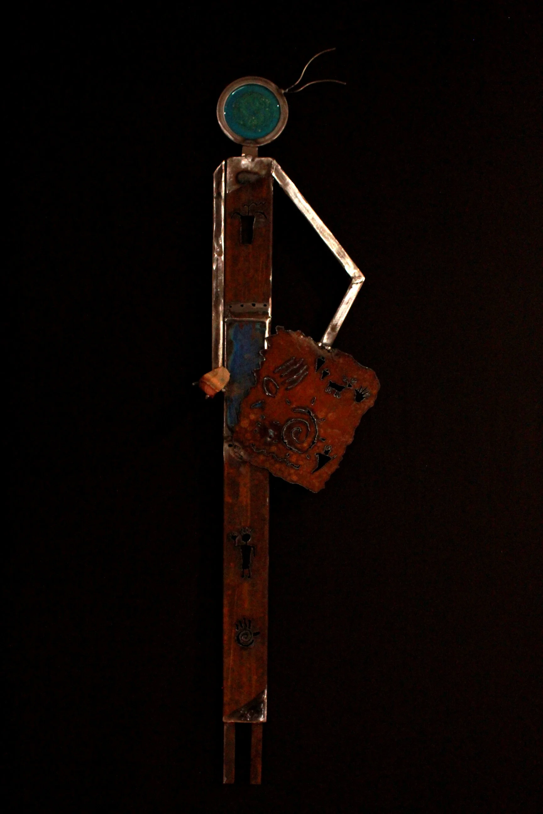Celebrating the fusion and magic of rocks, ancient rock art, and storytelling, the Be the Writer of Your Own Story Shaman is made predominately from repurposed metal. It features Ancestral Pueblo-inspired petroglyph symbols plasma cut by hand into the steel, including a few images found at Bears Ears National Monument in southeastern Utah.