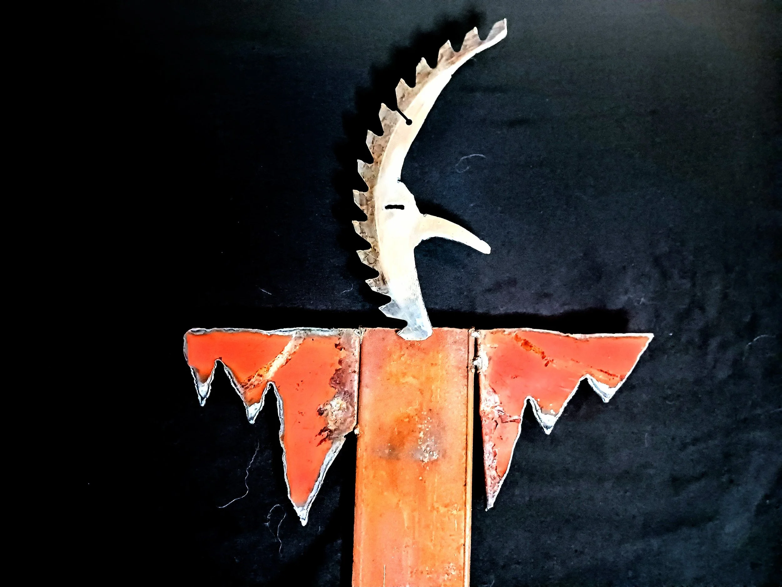 The Gotta Do Something About Where We're Goin' Kachina is made solely from salvaged metal. The head is part of an old circular saw blade. The rock art-inspired anthropomorphic image was plasma cut by hand. The head is part of an old circular saw blade. A mix of rust and old orange paint cover the wings.